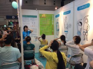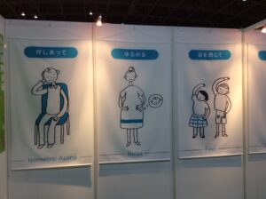 大きなスピーカーから大音量が流れ賑やかな環境での15分間のヨーガ療法体験。でもそんな環境の中でもしっかりと静けさと身体の中の変化を感じ取っていただいてました。