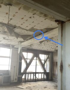 2階まで襲う大きな水のうねりと津波漂流物。1階の天井と柱の隙間に挟み込まれたビールの空き缶、剥がれ落ちた1階の天井、2階の壁やキャビネットに残る水跡